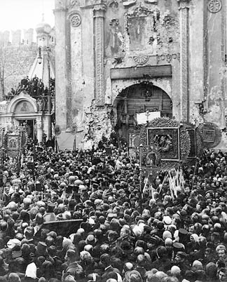 Как сообщают исследователи, народное предание донесло до нас рассказ о первом официальном праздновании 1 мая в большевистской России: «В первый советский Первомай на Красной площади в Москве на глазах тысяч людей было явлено чудо Божие: красное полотнище, закрывавшее икону Святителя Николая на Никольской башне Московского Кремля, неожиданно, без посторонней помощи, рассеклось сверху донизу, а полоски материи стали отрываться и падать вниз. И открылся старинный образ чтимого всей Русью Святителя Николая Можайского: левая рука с крестом была отстрелена во время большевицкой бомбардировки Кремля, правая с мечом грозно занесена».